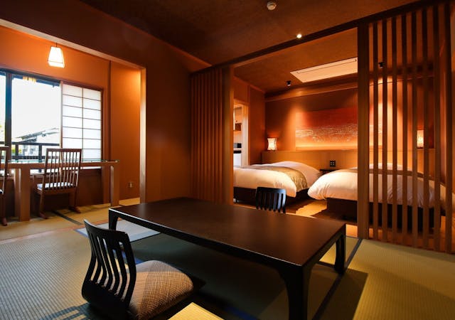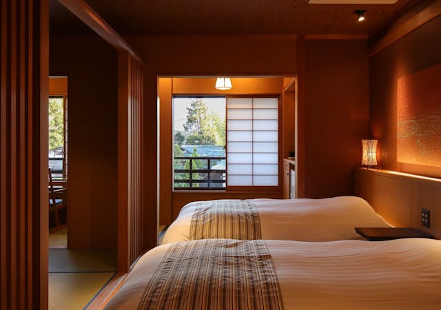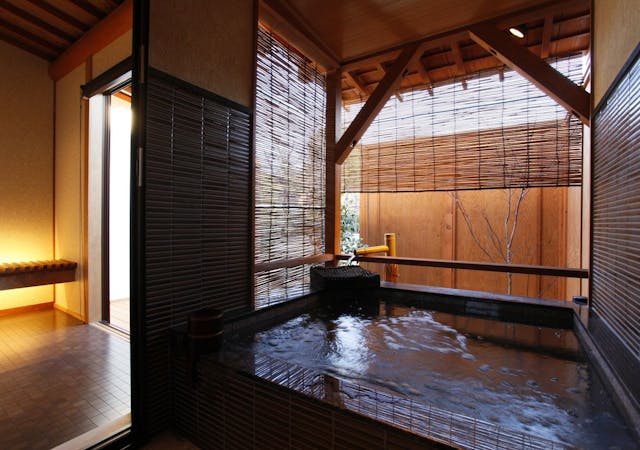 1階が露天風呂と湯上がりリビング、室内階段を上がって2階が主室、寝室になっている