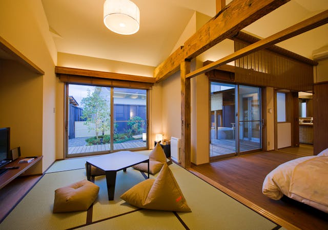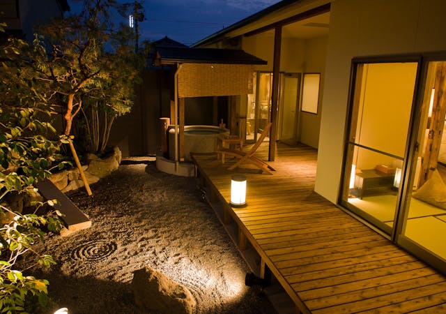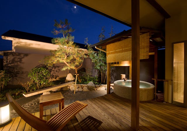風雅な草庵のように一つひとつが離れ形式になっている客室「みなと庵」。各室の露天風呂は、庭園や夜空を眺めながら浸かっていると自分が自然の中に溶け込んでいくかのように静かで開放的。露天風呂をプライベートに堪能できます。