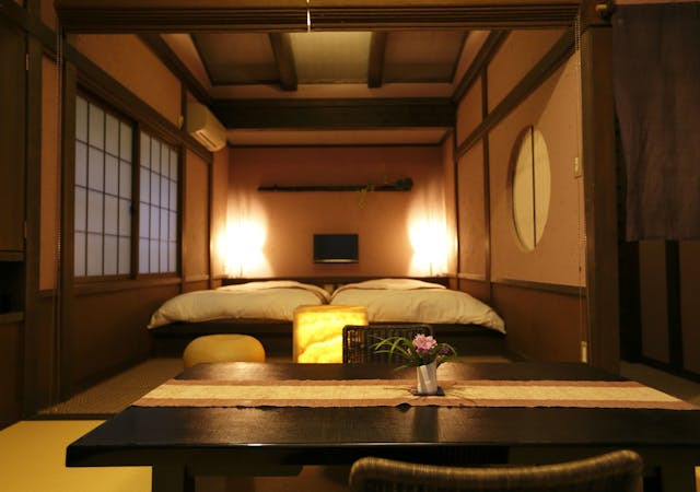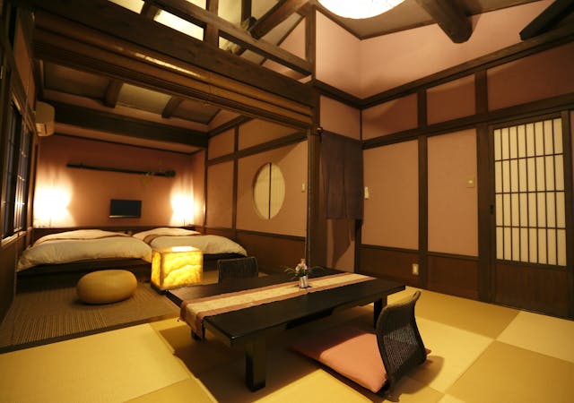 客室専用の露天風呂はございませんが、和ベッドを設えた寝間とお食事を召し上がる和室を簾で仕切り、広さや機能性も十分です。