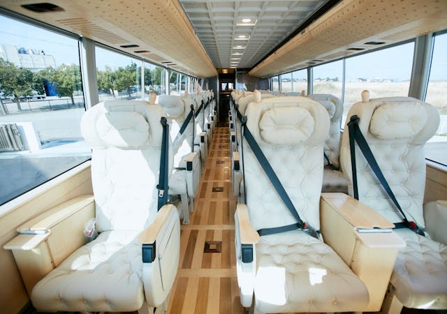 18席からなる特別製のシートは優しく体を包み込み、プライベートな空間を楽しむことができます。車内は木の質感を至る所に感じられ、後部にはバーカウンターとトイレが完備されております。バスに乗った瞬間から感動が始まる。