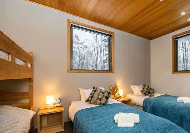 寝室:クイーンサイズベッド1室、クイーンサイズベッド1室、シングルベッド2台と2段ベッド1室
