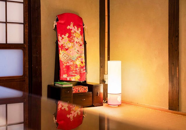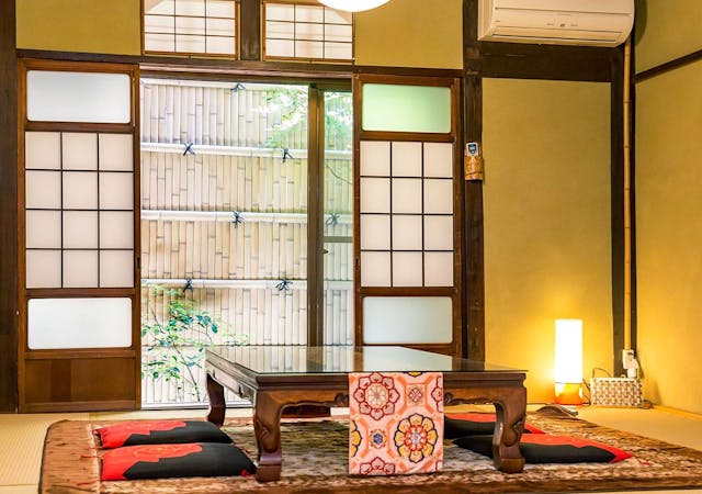 天井の網代、二階の大きな梁、鍾馗さんやちまきなど、京町家ならではの伝統的なしつらえを楽しんでいただき、床の間のある和室で坪庭を見ながら癒しの時間を。