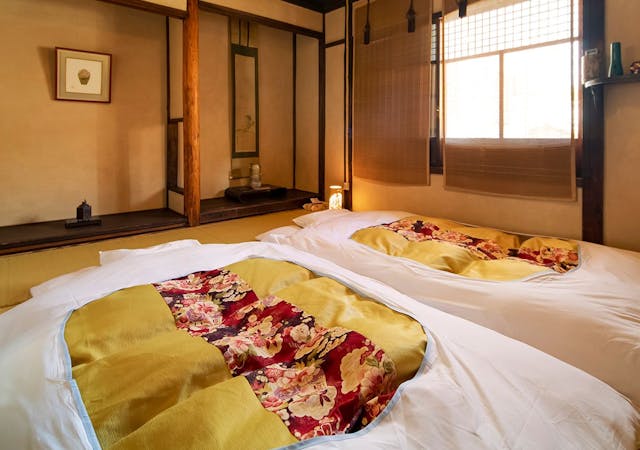 江戸末期から続く京都の伝統技法で作られた手作り寝具、真綿の敷布団は、寝心地よくぐっすりと快適な眠りへ誘います。掛け布団は、夏・冬ともに羽毛布団を使用。